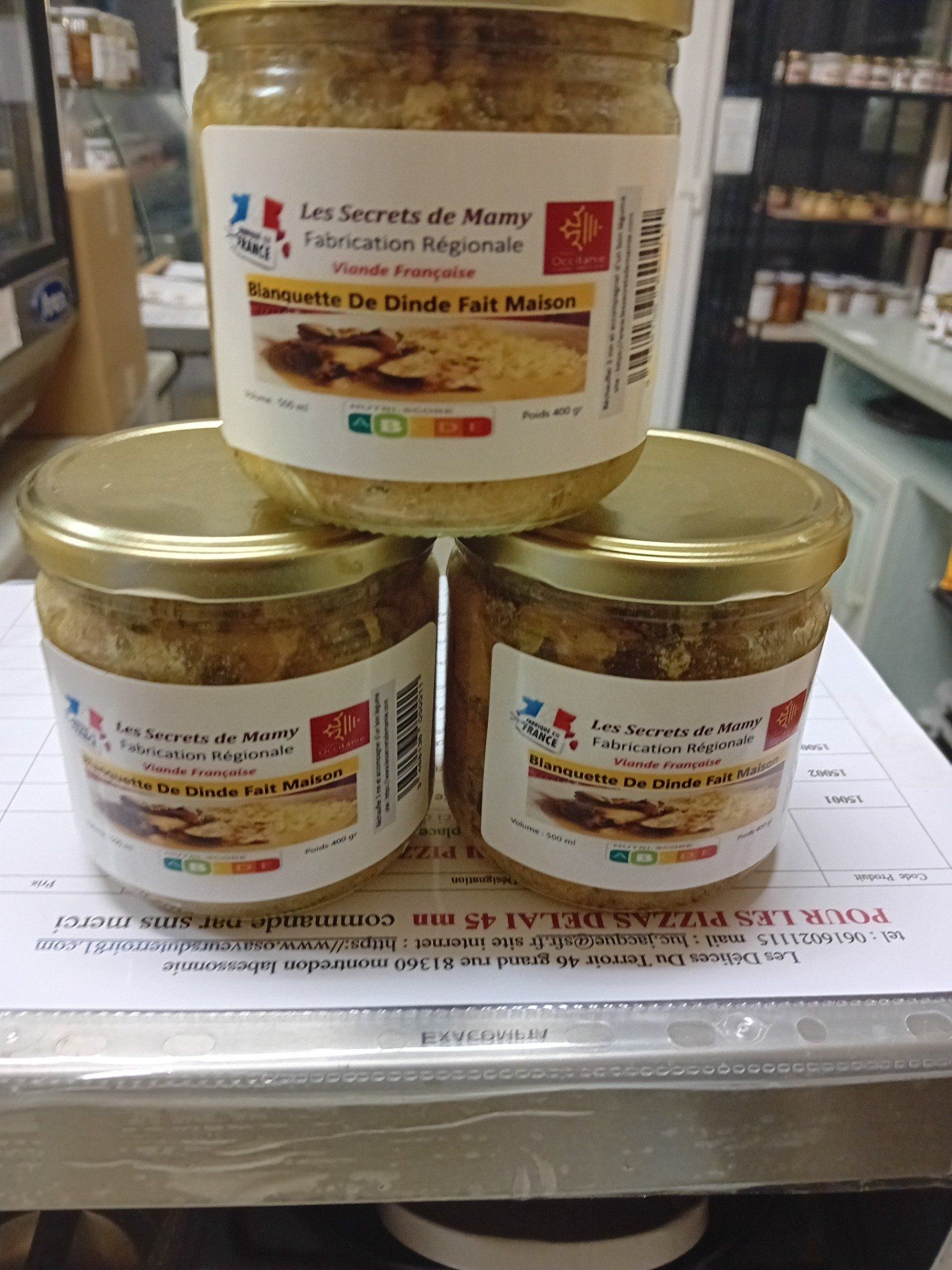 BLANQUETTE DE DINDE viande fra cuisinés maison avec sa sauce crème , champignons , un goût délicat pour le plaisir de vos papilles prix = 10 € un bon plat au tarif très raisonnable en conserves fait maison l pot de 500 ml ENV 400 gr